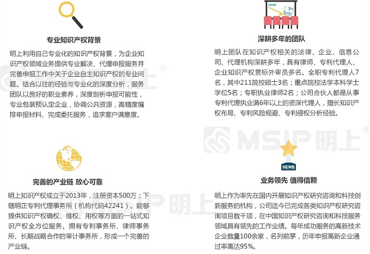 1、專業(yè)知識產(chǎn)權(quán)背景——明上利用自己專業(yè)化的知識產(chǎn)權(quán)背景,為企業(yè)知識產(chǎn)權(quán)領(lǐng)域業(yè)務(wù)提供專業(yè)解決、代理申報服務(wù)并完善雙軟認(rèn)證中關(guān)于企業(yè)自主知識產(chǎn)權(quán)的專業(yè)問題。