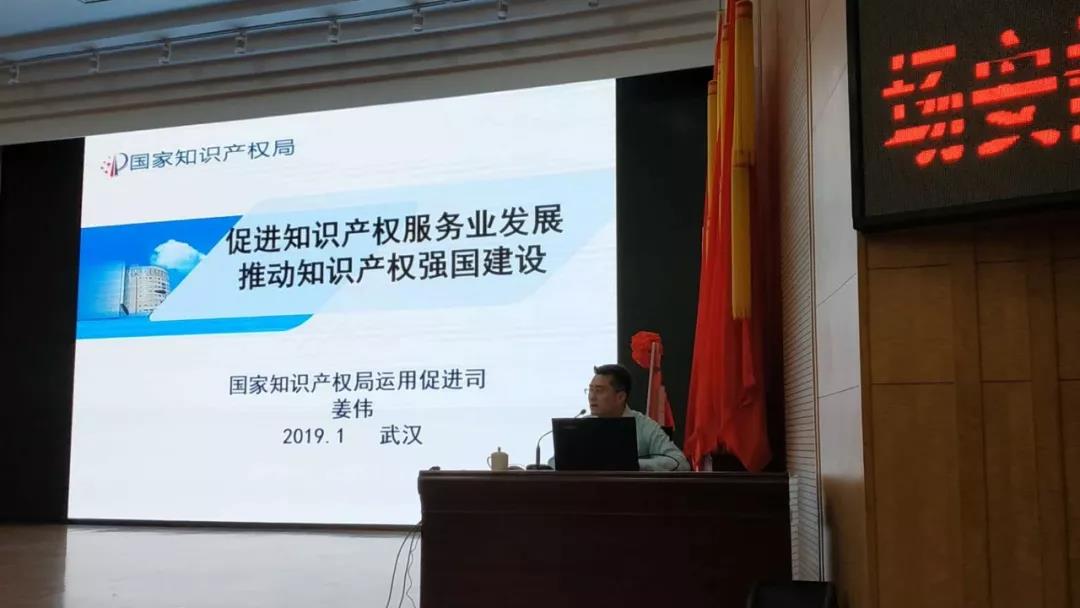 在成立大會結(jié)束之后,舉行專題培訓(xùn)會議。姜偉處長受邀做題為《促進知識產(chǎn)權(quán)服務(wù)業(yè)發(fā)展,推動知識產(chǎn)權(quán)強國建設(shè)》的培訓(xùn)講座。培訓(xùn)會由協(xié)會秘書長、武漢科技大學(xué)知識產(chǎn)權(quán)研究所副所長蔡祖國教授主持。