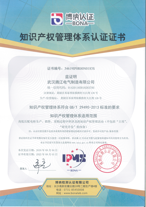 熱烈祝賀武漢騰江電氣制造有限公司于2019年9月獲得知識產權貫標認證證書,這意味著騰江電氣在知識產權領域獲得到重要認可,在知識產權方面得到進一步規(guī)范和在綜合競爭力得到進一步提升。