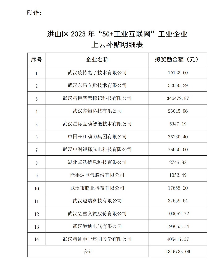 【公示】關(guān)于洪山區(qū)2023年“5G+工業(yè)互聯(lián)網(wǎng)”工業(yè)企業(yè)上云補(bǔ)貼的公示